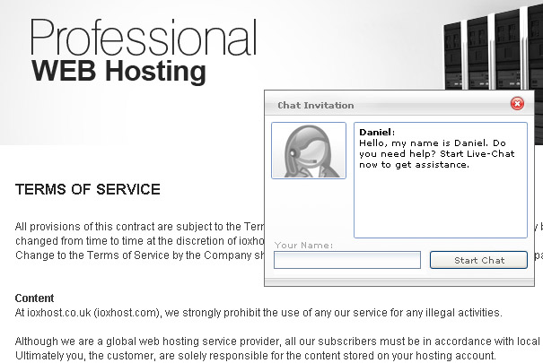 Funny thing is a chat window opened up while I was looking at the terms of service, the chat operator’s name is Daniel. Which is the same first name for the owner of the domain ioxhost.co.uk.